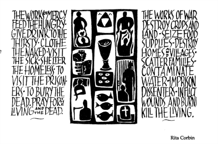 Rita Corbin also contributed much art to the Catholic Worker movement, including some of the Catholic Worker’s most memorable pieces. She lived from 1930-2011. An obituary in the National Catholic Reporter gives a good overview of her life and her influence on the Catholic Worker movement.